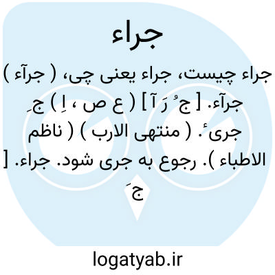 جراء. [ ج َرْ را ] ( ع اِ ) بخاطر. فعلت ُ من جرأک؛ یعنی کردم از بهرتو. ( از منتهی الارب ) ( اقرب الموارد ) ( ناظم الاطباء ). و مصراع زیر: «امن جرائنا صرتم عبیداً». به همین معنی است. ( اقرب الموارد ). جَرا. جَرّا. ( منتهی الارب ) ( اقرب الموارد ). رجوع به دو کلمه مزبور شود.