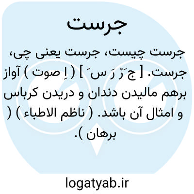 جرست. [ ج َرْ رَ س َ ] ( اِ صوت ) آواز برهم مالیدن دندان و دریدن کرباس و امثال آن باشد. ( ناظم الاطباء ) ( برهان ). آواز برهم زدن دو چیزو بر هم سودن دندان و آواز دریدن کرباس. ( غیاث اللغات ) ( آنندراج ). جرست به تخفیف نیز آمده. و برست بکسرتین و سین مهمله از توابع جرست است؛ آوازی که وقت بریان کردن کباب می آید. ( از غیاث اللغات ) ( آنندراج ).