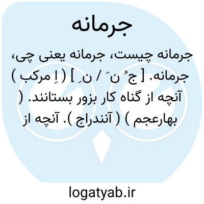 جرمانه. [ ج ُ ن َ / ن ِ ] ( اِ مرکب ) آنچه از گناه کار بزور بستانند. ( بهارعجم ) ( آنندراج ). آنچه از گنهکار گیرند. و جریمانه که شهرت دارد درست نیست. ( غیاث اللغات ). تاوان. جریمانه. کفاره. ( ناظم الاطباء ): مولانا عذر بسیار خواستند و فرمودند تصدیع خدمت کردیم و جرمانه آن پیش مولانا بردند. ( انیس الطالبین بخاری ص 192 ). گرد بی ادبی مگرد و الا فرمایم که ترا از در سرای بیاویزند و صد هزار ( دینار ) دیگر بخزانه جرمانه فرودآرم. ( دستور الوزراء ص 185 ).