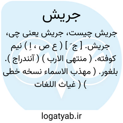 جریش. [ ج َ ] ( ع ص، اِ ) نیم کوفته. ( منتهی الارب ) ( آنندراج ). بلغور. ( مهذب الاسماء نسخه خطی ) ( غیاث اللغات ) ( از اقرب الموارد ) ( از متن اللغة ) ( ناظم الاطباء ). جشیش. بلبور. قرمنن. دشیش. ( یادداشت مؤلف ). || مرد رسا. ( منتهی الارب ) ( آنندراج ). مرددلیر رسا. ( ناظم الاطباء ) ( از اقرب الموارد ) ( از متن اللغة ). || نمک خوش ناکرده. ( منتهی الارب ) ( از متن اللغة ) ( از اقرب الموارد ) ( ناظم الاطباء ). || ( اِخ ) نام ماده بزی است. ( منتهی الارب ).