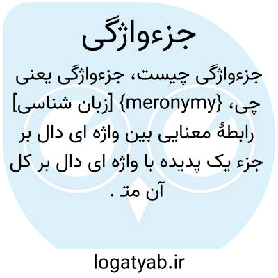 {meronymy} [زبان شناسی] رابطۀ معنایی بین واژه ای دال بر جزء یک پدیده با واژه ای دال بر کل آن متـ. مجاز جزءبه کل