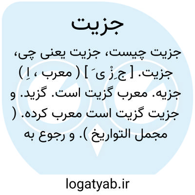 جزیة. [ ج ِزْ ی َ ] ( معرب، اِ ) خراج زمین. ( منتهی الارب ) ( از اقرب الموارد ) ( از متن اللغة ) ( از ناظم الاطباء ). || آنچه از ذمی گیرند. ( منتهی الارب ) ( از متن اللغة ) ( از اقرب الموارد ). این لفظ مأخوذ از گَزیت و گِزْیَت فارسی است. ( ناظم الاطباء ). آنچه بر کفار ذمی در سال مقرر دارند. معرب گزیه. ( آنندراج ). جزیت. گِزْیَت. ( محمودبن عمر ربنجنی ). سرگزیت. ( ترجمان القرآن عادل بن علی ). آنچه بر کافری ذمی در بلاد اسلام از خراج مقرر آید. گزید. سرگزید. سرانه. مجرک. ( یادداشت مؤلف ). باج سرشمار. ج، جَزاء، جِزی ̍، جُزی ̍.( منتهی الارب ). ج، جِزاء. ( متن اللغة ) ( ناظم الاطباء ). در اصطلاح فقهی مالی است که بر ذمی وضع شود و آنرا خراج و مالیات سرانه نیز گویند. این چنین در جامعالرموز آمده است. ( از کشاف اصطلاحات الفنون ). مالی که کفار به التزام به شرایط ذمه به مسلمانان میدهند. کفار کتابی با تعهد به شرایط ذمه از مورد تعرض بودن مصون هستند و پرداخت جزیه یکی از عناصر آن بشمار میرود و در حقیقت یک قسم مالیاتی است که هرساله از ایشان اخذمیشود. جزیه ممکن است بصورت مالیات سرانه و یا مالیات ارضی و یا به هر دو عنوان دریافت شود و مقدار آن بر وفق مقتضای اوضاع از طرف حاکم معین میگردد: و مردم ولایت نعمتی بسیار بدادند و جزیه به خود گرفتند. ( فارسنامه ابن البلخی ص 115 ). بیست هزار بارهزار درم به ارش عصیان و فدیه عدوان و جزیه طغیان بر گردن ایشان نهاد. ( ترجمه تاریخ یمینی ص 262 ).