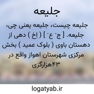 جلیعه. [ ج َ ع َ ] ( اِخ ) دهی از دهستان بلوک شرقی بخش مرکزی شهرستان دزفول واقع در 20هزارگزی جنوب خاوری دزفول و 20هزارگزی جنوب راه شوش به دزفول موقع جغرافیایی آن دشت و هوای آن گرمسیری مالاریائی است. سکنه آن 200 تن. آب آنجا از رودخانه دز و محصول آن غلات، برنج، و کنجدو شغل اهالی زراعت است. راه مالرو دارد. ساکنین از طایفه لر هستند. ( از فرهنگ جغرافیایی ایران ج 6 ).