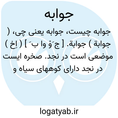 ( جوابة ) جوابة. [ ج َوْ وا ب َ ] ( اِخ ) موضعی است در نجد. صخره ایست در نجد دارای کوههای سیاه و کوچک. رجوع به معجم البلدان شود.
