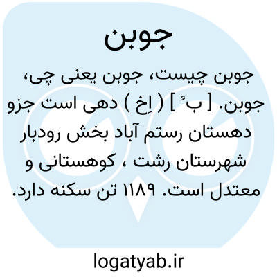 جوبن. [ ب ُ ] ( اِخ ) دهی است جزو دهستان رستم آباد بخش رودبار شهرستان رشت، کوهستانی و معتدل است. 1189 تن سکنه دارد. آب آن از رودخانه جوبن و محصول آن غلات، زیتون، لبنیات، بنشن و شغل اهالی زراعت و گله داری و شالبافی است. این ده دارای پنج محله است. ( از فرهنگ جغرافیایی ایران ج 2 ).