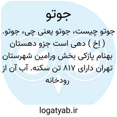 جوتو. ( اِخ ) دهی است جزو دهستان بهنام پازکی بخش ورامین شهرستان تهران دارای 817 تن سکنه. آب آن از رودخانه جاجرود و محصول آن غلات، صیفی، چغندرقند و شغل اهالی زراعت است. مزرعة قشلاق خدابخش جزو این ده است. ( از فرهنگ جغرافیایی ایران ج 1 ).