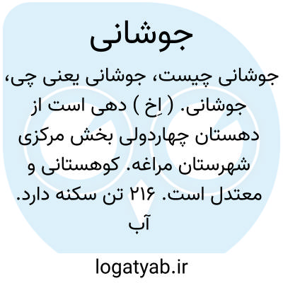 جوشانی. ( اِخ ) دهی است از دهستان چهاردولی بخش مرکزی شهرستان مراغه. کوهستانی و معتدل است. 216 تن سکنه دارد. آب آن از چشمه و محصول آن نخود، بادام، غلات، کرچک و شغل زراعت و گله داری است. این ده در دو محل قرار گرفته و بنام جوشانی بالا و جوشانی پائین مشهور است. ( از فرهنگ جغرافیایی ایران ج 4 ).