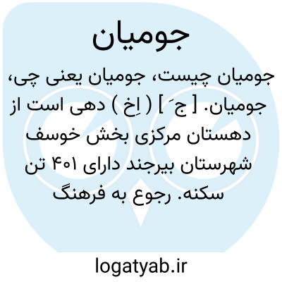 جومیان. [ ج َ ] ( اِخ ) دهی است از دهستان مرکزی بخش خوسف شهرستان بیرجند دارای 401 تن سکنه. رجوع به فرهنگ جغرافیایی ایران ج 9 شود.