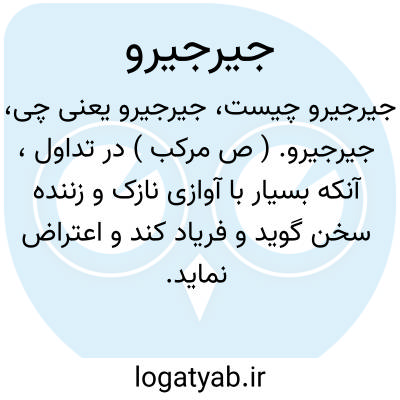 جیرجیرو. ( ص مرکب ) در تداول، آنکه بسیار با آوازی نازک و زننده سخن گوید و فریاد کند و اعتراض نماید. آنکه چون گنجشک بسیار سر و صدا راه بیندازد. آنکه بسیار جیرجیر کند. ( یادداشت بخط مرحوم دهخدا ).