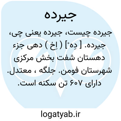 جیرده. [ دِه ْ] ( اِخ ) دهی جزء دهستان شفت بخش مرکزی شهرستان فومن. جلگه، معتدل. دارای 607 تن سکنه است. آب آن از چشمه و استخر و محصول آن برنج، ابریشم و شغل اهالی زراعت و مکاری گری است. ( از فرهنگ جغرافیایی ایران ج 2 ).