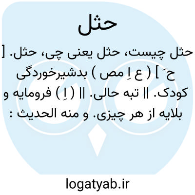 حثل. [ ح َ ] ( ع اِ مص ) بدشیرخوردگی کودک. || تبه حالی. || ( اِ ) فرومایه و بلایه از هر چیزی. و منه الحدیث: اعوذبک أن أبقی فی حثل من الناس. ( منتهی الارب ). حثالة. حثل. [ ح ِ ] ( ع ص ) لاغر و باریک اندام. ( منتهی الارب ).