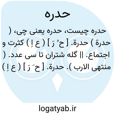 ( حدرة ) حدرة. [ ح ُ رَ ] ( ع اِ ) کثرت و اجتماع. || گله شتران تا سی عدد. ( منتهی الارب ).