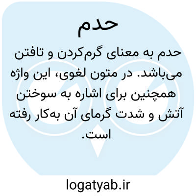 حدم. [ ح َ دَ / ح َ ] ( ع مص ) گرم کردن. ( تاج المصادر بیهقی ). سوختن آتش. || گرمی سخت. حدم نار؛ سختی احراق آتش و گرمی آن. ( منتهی الارب ). سختی گرمای خورشید. ( معجم البلدان ). و برای مقایسه این کلمه با حمد و مدح و ارتباط این ریشه ها که مقلوب یکدیگرند به نشوء اللغة العربیة صص 129- 130 رجوع شود.