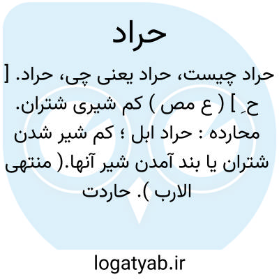 حراد. [ ح ِ ] ( ع مص ) کم شیری شتران. محارده: حراد ابل؛ کم شیر شدن شتران یا بند آمدن شیر آنها.( منتهی الارب ). حاردت الناقة؛ قل لبنها: