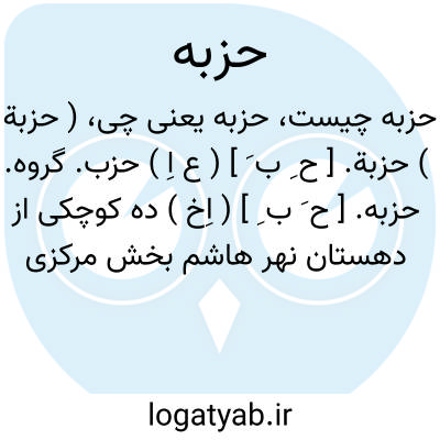 حزبه. [ ح َ ب ِ ] ( اِخ ) ده کوچکی از دهستان نهر هاشم بخش مرکزی شهرستان اهواز است در 8 هزارگزی باختر اهواز و یکهزارگزی راه اهواز به سوسنگرد.30 تن سکنه دارد. ( از فرهنگ جغرافیائی ایران ج 6 ).