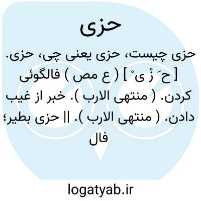 لغت نامه دهخدا حزی. [ ح َ زْ ی ْ ] ( ع مص ) فالگوئی کردن. ( منتهی الارب ). خبر از غیب دادن. ( منتهی الارب ). || حزی بطیر؛ فال گرفتن به مرغان. بانگ به مرغان زدن به تفائل. || حزی السراب الشخص؛ برداشتن سراب شخص را. ( منتهی الارب ). || حزی نخل؛ دید زدن بار خرما بر درخت. تخمین بار خرما بازناکرده، اندازه کردن بار خرما بر درخت. ( منتهی الارب ). حزر.حزی. [ ح ُزْ ز ] ( ع ص نسبی ) منسوب به حُزه، شهری نزدیک موصل. ازبناهای اردشیربن بابک. ( سمعانی ).