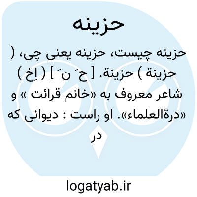 ( حزینة ) حزینة. [ ح َ ن َ ] ( اِخ ) شاعر معروف به «خانم قرائت » و «درةالعلماء». او راست: دیوانی که در زمان حیات ناظم در 1332 هَ. ق. در تهران چاپ شده است. ( ذریعه ج 9 ص 235 ).