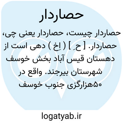 حصاردار. [ ح ِ ] ( اِخ ) دهی است از دهستان قیس آباد بخش خوسف شهرستان بیرجند. واقع در 50هزارگزی جنوب خوسف سر راه مالرو عمومی علی آباد. ناحیه ای است واقع در دامنه. معتدل. دارای 45 تن سکنه میباشد. فارسی زبانند. از قنات مشروب میشود. محصولات آنجا غلات، بنشن، پنبه، لبنیات. اهالی به کشاورزی و مالداری گذران میکنند. راه مالرو است و در تابستان میتوان اتومبیل برد. ( از فرهنگ جغرافیایی ایران ج 9 ).