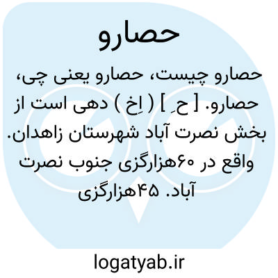 حصارو. [ ح ِ ] ( اِخ ) دهی است از بخش نصرت آباد شهرستان زاهدان. واقع در 60هزارگزی جنوب نصرت آباد. 45هزارگزی خاور شوسه بم به نصرت آباد. ناحیه ای است واقع در جلگه. گرمسیر. دارای 400 تن سکنه میباشد. بلوچی زبانند. از قنات مشروب میشود. محصولات آنجا غلات، ذرت، لبنیات. اهالی به کشاورزی، گله داری گذران میکنند. راه مالرو است. ( از فرهنگ جغرافیایی ایران ج 8 ).