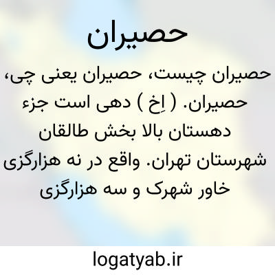 حصیران. ( اِخ ) دهی است جزء دهستان بالا بخش طالقان شهرستان تهران. واقع در نه هزارگزی خاور شهرک و سه هزارگزی راه مالروی عمومی بالا. ناحیه ای است واقع در کوهستان سردسیر. دارای 197 تن سکنه میباشد. از رودخانه کربود و کوئین و چشمه سار مشروب میشود. محصولاتش غلات، اسپرس،سیب زمینی، لوبیا، میوه جات مختلفه و گردو. اهالی به کشاورزی گذران میکنند. عده ای برای تأمین معاش به تهران، مازندران و گیلان میروند و عده ای کارمند ادارات هستند. از صنایع دستی آنان کرباس و گلیم بافی است. راه آن مالرو است. ( از فرهنگ جغرافیایی ایران ج 1 ).
