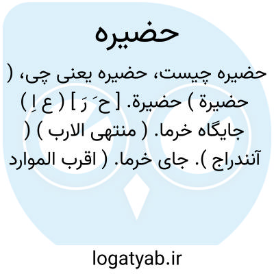 ( حضیرة ) حضیرة. [ ح َ رَ ] ( ع اِ ) جایگاه خرما. ( منتهی الارب ) ( آنندراج ). جای خرما. ( اقرب الموارد ). || گروه مردم یا چهار تن یا پنج تن یا هشت یا هفت تن یا ده تن یا کم از ده تن که بغزو [ جنگ ] روند. ( منتهی الارب ) ( اقرب الموارد ) ( آنندراج ). چهار پنج تن. ( مهذب الاسماء ). ج، حضائر. ( از مهذب الاسماء ). || اول لشکر. مقدمه. || آنچه برآید از رحم هنگام زادن. ( منتهی الارب ) ( اقرب الموارد ). ریم و زردآب که با بچه بیرون آید بعد از برطرف شدن خون نفاس. ( آنندراج ). آنچه با بچه بیرون آید از رطوبات. ج، حضیر، حضایر. || خون سطبر درپوستی که با بچه بیرون آید. ( منتهی الارب ) ( آنندراج ). || ریم گردآمده در ریش. ریم که در جراحت گرد آید. ( اقرب الموارد ) ( منتهی الارب ) ( آنندراج ).