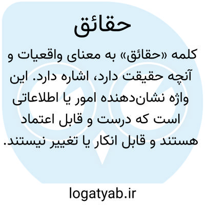 کلمه «حقائق» به معنای واقعیات و آنچه حقیقت دارد، اشاره دارد. این واژه نشان‌دهنده امور یا اطلاعاتی است که درست و قابل اعتماد هستند و قابل انکار یا تغییر نیستند. حقائق معمولاً بر پایه شواهد یا تجربه معتبر شکل می‌گیرند و با نظر شخصی یا حدس و گمان تفاوت دارند.