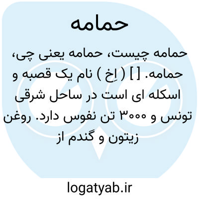 حمامه. [ ] ( اِخ ) نام یک قصبه و اسکله ای است در ساحل شرقی تونس و 3000 تن نفوس دارد. روغن زیتون و گندم از این محل صادر میشود. یک سور گرداگرد وی را فراگرفته در بیرون سور باغها و بستانهای دلگشا و باصفا دارد ونیز بناهای عالی در آن مشاهده میگردد و خرابه های یک شهر قدیم در حومه های آن یافت شود. ( قاموس الاعلام ).