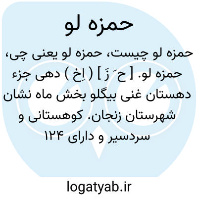 حمزه لو. [ ح َ زَ ] ( اِخ ) دهی جزء دهستان غنی بیگلو بخش ماه نشان شهرستان زنجان. کوهستانی و سردسیر و دارای 124 تن سکنه است. از رودخانه چهره آباد مشروب میشود و محصول آن غلات و بنشن است. شغل اهالی زراعت. صنایع دستی آنان گلیم و جاجیم بافی است. راه مالرو دارد. ( از فرهنگ جغرافیایی ایران ج 2 ).