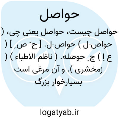 ( حواص-ل ) حواص-ل. [ ح َ ص ِ ] ( ع اِ ) ج ِ حوصله. ( ناظم الاطباء ) ( زمخشری ). و آن مرغی است بسیارخوار بزرگ حوصله و این جمع را فارسی زبانان بجای مفرد بکار برند،همان مرغ. مرغی است سپید که اکثر بر کناره آبها نشیند و چون حوصله نهایت کلان دارد، بر واحد اطلاق آن جمع کرده اند چه در حقیقت حواصل جمع حوصله است. ( غیاث ) ( آنندراج ) ( ناظم الاطباء ):