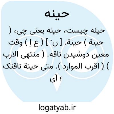 ( حینة ) حینة. [ ن َ ] ( ع اِ ) وقت معین دوشیدن ناقه. ( منتهی الارب ) ( اقرب الموارد ). متی حینة ناقتک؛ اَی وقت حلبها. || مقدار شیر ناقه: و کم حینة ناقتک؛ ای کم حلابها یعنی چند شیر میدهد. || یک بار خوردن. ( منتهی الارب ). یک بار طعام خوردن در شبانه روز.( بحر الجواهر ): هویأکل الحینة ( و یفتح )؛ او میخوردیک بار در روز و شب. ( منتهی الارب ). یک بار در روز ووشب. ( منتهی الارب ) ( اقرب الموارد ). || حین: ما القاء الاالحینة بعد الحینة؛ اَی الحین بعدالحین. ( اقرب الموارد ) ( منتهی الارب ). رجوع به حین شود.