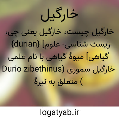 {durian} [زیست شناسی- علوم گیاهی] میوۀ گیاهی با نام علمی خارگیل سموری (Durio zibethinus ) متعلق به تیرۀ پنیرکیان و راستۀ پنیرک سانان که طول آن به سی سانتی متر و قطر آن به پانزده سانتی متر می رسد و وزن آن یک تا سه کیلوگرم است؛ شکل آن گِرد وگاه کشیده و پوستۀ آن...