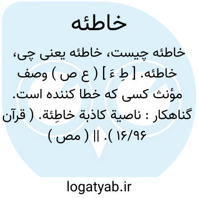 خاطئه. [ طِ ءَ ] ( ع ص ) وصف مؤنث کسی که خطا کننده است. گناهکار: ناصیة کاذبة خاطِئة. ( قرآن 16/96 ). || ( مص ) مصدر اخطاء و هذه الصیغة نادرة فی مصادر المزیدات کعافیة مصدر عافی. ( اقرب الموارد ): و المؤتفکات بالخاطئة. ( قرآن 29/12 ).