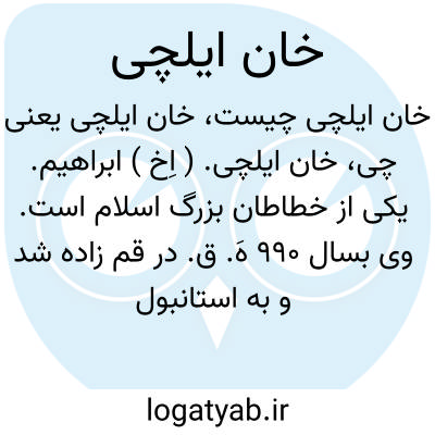 خان ایلچی. ( اِخ ) ابراهیم. یکی از خطاطان بزرگ اسلام است. وی بسال 990 هَ. ق. در قم زاده شد و به استانبول نزد سلطان مرادخان رفت. خط نسخ و نستعلیق نیکو مینوشت. ( از قاموس الاعلام ترکی ج 3 ص 2020 ).
