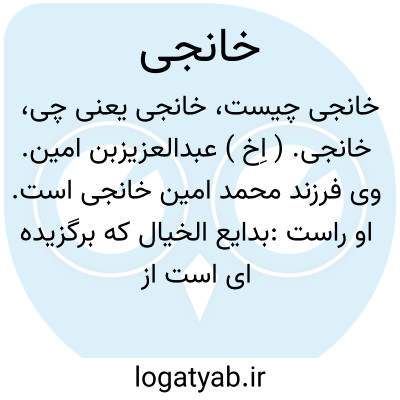 خانجی. ( اِخ ) عبدالعزیزبن امین. وی فرزند محمد امین خانجی است. او راست:بدایع الخیال که برگزیده ای است از مبتکرات فیلسوف روسی تولستوی. این کتاب بوسیله او و اسماعیل یوسف الدوری بزبان عربی برگردانده شد و در مطبعه صباح بسال 1336 هَ. ق. ( 1918 م. ) در 100 صفحه به چاپ رسید. ( از معجم المطبوعات ). رجوع به خانجی محمد امین شود.