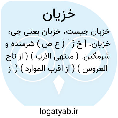 خزیان. [ خ َزْ ] ( ع ص ) شرمنده و شرمگین. ( منتهی الارب ) ( از تاج العروس ) ( از اقرب الموارد ) ( از لسان العرب ). ج، خزایا.