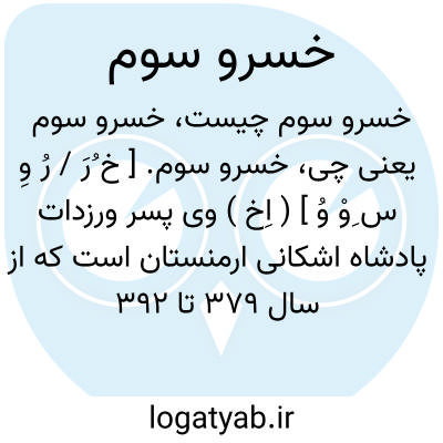 خسرو سوم. [ خ ُرَ / رُ وِ س ِوْ وُ ] ( اِخ ) وی پسر ورزدات پادشاه اشکانی ارمنستان است که از سال 379 تا 392 م. سلطنت کرد. پسر او تیگران پس از خسرو سوم در 416 م. پادشاه ارمنستان ایران شد. ( از ایران باستان ج 3 ص 2621 ).