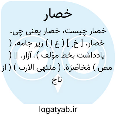 خصار. [ خ ِ ] ( ع اِ ) زیر جامه. ( یادداشت بخط مؤلف ). آزار. || ( مص ) مُخاصَرَة. ( منتهی الارب ) ( از تاج العروس ) ( از لسان العرب ) ( از اقرب الموارد ). رجوع به مخاصرة شود.