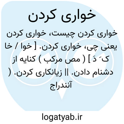 خواری کردن. [ خوا / خا ک َ دَ ] ( مص مرکب ) کنایه از دشنام دادن. || زیانکاری کردن. ( آنندراج ) ( انجمن آرای ناصری ). || تحقیر کردن. استحقار. استخفاف. ( یادداشت مؤلف ): جماعتی از بزرگ زادگان بر وی خواری کردند و از خداوندان تعلیم گفتند و تو از کجا و علم خواندن کجا؟ ( مجمل التواریخ و القصص ).