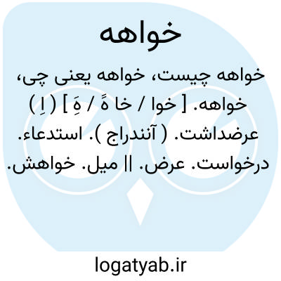 خواهه. [ خوا / خا هََ / هَِ ] ( اِ ) عرضداشت. ( آنندراج ). استدعاء. درخواست. عرض. || میل. خواهش. رغبت. || مقصود. مراد. ( ناظم الاطباء ). || آرزو. ( آنندراج ).