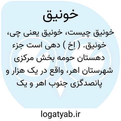 خونیق. ( اِخ ) دهی است جزء دهستان حومه بخش مرکزی شهرستان اهر، واقع در یک هزار و پانصدگزی جنوب اهر و یک هزارگزی شوسه تبریز به اهر. دارای 685 تن سکنه. آب آن از دو رشته چشمه و راه مالرو است. ( از فرهنگ جغرافیایی ایران ج 4 ).