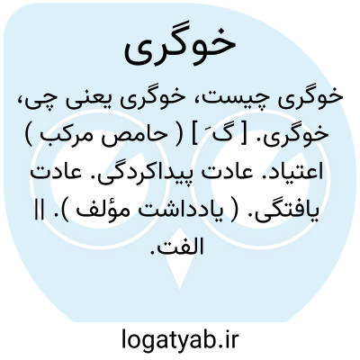 خوگری. [ گ َ ] ( حامص مرکب ) اعتیاد. عادت پیداکردگی. عادت یافتگی. ( یادداشت مؤلف ). || الفت. انس. الفت یافتگی. انس پیداکردگی. استیناس. ( یادداشت مؤلف ): خوگری از عاشقی بتر بود. ( کلیله و دمنه ).