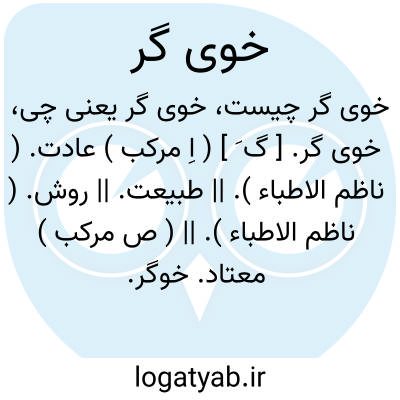 خوی گر. [ گ َ ] ( اِ مرکب ) عادت. ( ناظم الاطباء ). || طبیعت. || روش. ( ناظم الاطباء ). || ( ص مرکب ) معتاد. خوگر. ( یادداشت بخط مؤلف ). مُعاوِد. خوی گر بچیزی. تمرین؛ خوی گر ساختن کسی را بچیزی. ( منتهی الارب ).