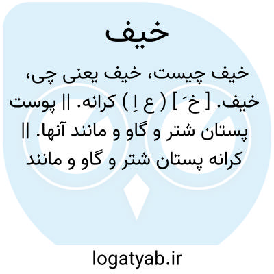 خیف. [ خ َ ] ( ع اِ ) کرانه. || پوست پستان شتر و گاو و مانند آنها. || کرانه پستان شتر و گاو و مانند آنها. || پوست پستان شتر ماده. || غلاف نره شتر. || جای فروتر از درشتی کوه و بلندتر از مسیل آب. || هر نشیب و بلندی در روی کوه. || ( مص ) مصدر دیگر است برای «خوف ». ( منتهی الارب ) ( از تاج العروس ) ( از لسان العرب ).