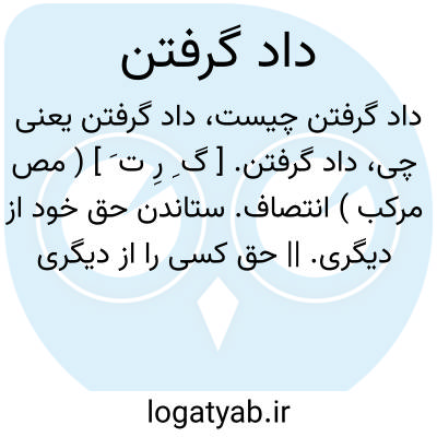 داد گرفتن. [ گ ِ رِ ت َ ] ( مص مرکب ) انتصاف. ستاندن حق خود از دیگری. || حق کسی را از دیگری گرفتن، داد ستدن:خدا داد مرا از تو بگیرد؛ سزای ستمکاری ترا بدهد.