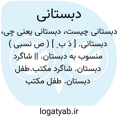 دبستانی. [ دَ ب ِ ] ( ص نسبی ) منسوب به دبستان. || شاگرد دبستان. شاگرد مکتب.طفل دبستان. طفل مکتب خانه. ( برهان ). بچه مکتبی. سبق خوان. متکلم. دیسانی. ( لغت محلی شوشتر ):