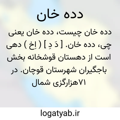 دده خان. [ دَ دِ ] ( اِخ ) دهی است از دهستان قوشخانه بخش باجگیران شهرستان قوچان. در 71هزارگزی شمال باختری باجگیران. سرراه مالرو عمومی باجگیران. کوهستانی و سردسیر. دارای 117 تن سکنه آب آن از چشمه. محصول آنجا غلات و شغل اهالی زراعت و مالداری و قالیچه و گلیم و جوراب بافی و راه آنجا مالروست. ( از فرهنگ جغرافیایی ایران ج 9 ).