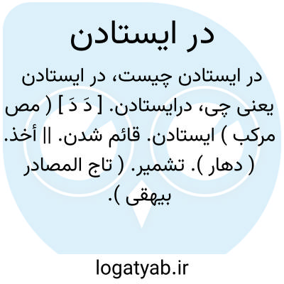 درایستادن. [ دَ دَ ] ( مص مرکب ) ایستادن. قائم شدن. || أخذ. ( دهار ). تشمیر. ( تاج المصادر بیهقی ). جعل. ( دهار ).طفق. ( ترجمان القرآن جرجانی ). آغاز کردن. شروع کردن. آغازیدن به انجام کاری. اقدام کردن. مبادرت کردن. پرداختن. مشغول شدن: اگر فرمان باشد بازگویم، گفت نیک آمد، من درایستادم و هرچه وزیر گفته بودبتمامی بازگفتم. ( تاریخ بیهقی چ ادیب ص 487 ). گفتند رواست ما از گردن خویش بیرون کنیم و درایستادند و پیغامی دراز دادند هم از آن نمط که وزیر نبشته بود. ( تاریخ بیهقی ص 677 ). درایستاده است و خویشتن را و شعر خویش ستودن گرفته است. ( تاریخ بیهقی ص 615 ). درایستادو هرچه رفته بود با وزیر بگفت. ( تاریخ بیهقی ص 593 ).من [ بونصرمشکان ] درایستادم و حال حسنک و رفتن به حج... بتمامی شرح کردم. ( تاریخ بیهقی ص 179 ). او را چندین مناقبست و درایستاد و فضایل ابن موسی اشعری که یاد کردیم مجموع بر شمرد. ( تاریخ قم ص 294 ). طفق، طفقان، طفوق؛ درایستادن در کاری. ( دهار ). قنوت؛ در نمازدرایستادن. ( تاج المصادر بیهقی ). || به اصرار کردن پرداختن. مصر شدن. ابرام ورزیدن. به سماجت دنبال کردن. به اصرار مبادرت کردن: و در بلخ در ایستاد [ بوسهل ] و در امیر می دمید که ناچار حسنک را بر دار باید کرد. ( تاریخ بیهقی چ ادیب ص 177 ).پس گروهی زنان را بر این کار بگماشتند و ایشان درایستادند و حیلت ساختند تا اسما را بر آن جانب بردند. ( تاریخ بیهقی ص 189 ). || مقاومت کردن. استقامت کردن. ایستادگی کردن. مداومت کردن: من درایستم اگر جانم بشود، تا این کار به صلح راست شود. ( تاریخ بیهقی چ ادیب ص 422 ). پس از آن فضل درایستاد، تا نام ولایت عهد از مأمون بیفکندند. ( تاریخ بیهقی ) بازرگانان پراکنده شدند و من درایستادم و غلامان می خریدم ده ساله و یازده ساله. ( مجمل التواریخ و القصص ). خواجه احمد سخن وی بشنود و راه به ده برد و درایستاد. ( تاریخ بیهقی ص 414 ). || اقامت کردن. ماندن. || پدید آمدن. آشکار شدن. آغاز کردن: از آن لحظه که تو قدم از خانه بیرون نهادی، طوفان نوح و صاعقه هود و عذاب ثمود درایستاد. ( سندبادنامه ص 97 ). || موافقت کردن. همراهی نمودن: مواضغة؛ با کسی بر چیزی درایستادن. ( دهار ).