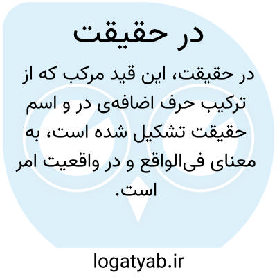 در حقیقت، این قید مرکب که از ترکیب حرف اضافه‌ی در و اسم حقیقت تشکیل شده است، به معنای فی‌الواقع و در واقعیت امر است. این واژه بیانگر وقوع یا صحت امری به‌گونه‌ای است که مطابق با واقعیت و حقایق موجود باشد. کاربرد آن در جمله بر قطعیت و یقین گوینده نسبت به موضوع مورد اشاره دلالت دارد. بر اساس منابع معتبر لغت‌نامه‌ای همچون آنندراج و ناظم‌الاطباء، این واژه به‌صورت مترادف با عباراتی چون براستی، بردرستی و یقیناً به کار رفته و بر تأکید بر صحت و درستی یک گزاره یا واقعه تأکید می‌کند. بنابراین، می‌توان آن را معادل دقیق اصطلاح عربی فی‌الحقیقه دانست که بر امری واقعی و غیرقابل انکار اشاره دارد.