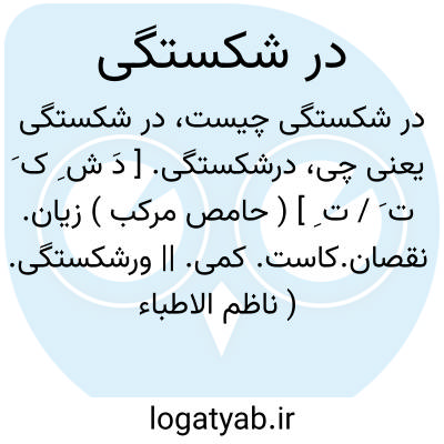 درشکستگی. [ دَ ش ِ ک َ ت َ / ت ِ ] ( حامص مرکب ) زیان. نقصان.کاست. کمی. || ورشکستگی. ( ناظم الاطباء ).