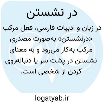 در زبان و ادبیات فارسی، فعل مرکب درنشستن بهصورت مصدری مرکب بهکار میرود و به معنای نشستن در پشت سر یا دنبالهروی کردن از شخصی است. این واژه در متون کهن و فرهنگهای لغت، از جمله کتاب دهار، با همین معنا ثبت شده و نمونههایی چون از پی کسی درنشستن گواه این کاربرد است. همچنین، این واژه در بیان حالتهای خاصی مانند به زانو درنشستن نیز بهکار رفته که نشاندهنده تنوع کاربردی آن در ساختارهای زبانی گذشته است.
